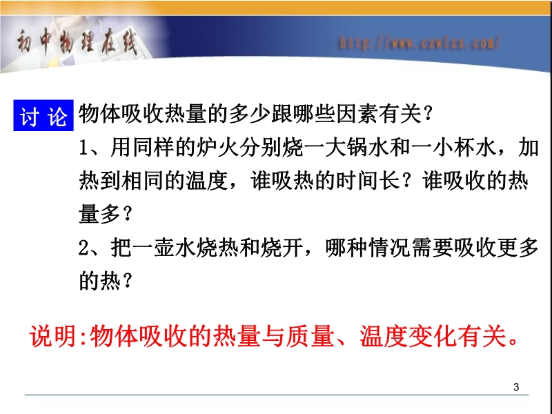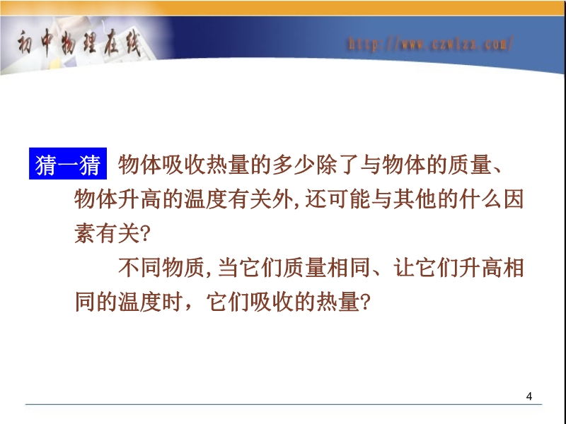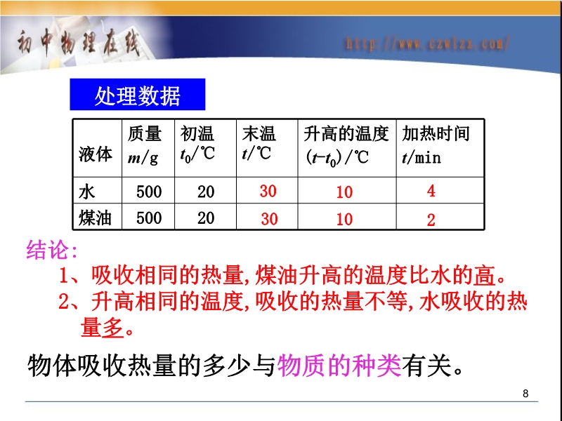 【内容简介】人教版:《13..3 比热容》ppt+视频课件,本课件以人教版新教材第十三章第三节为基础制作,共由25张幻灯片和1个视频组成,课件引导学生讨论了比热容的概念、意义、单位、计算方法及应用等,课件重点引导学生通过实验探究研究了物质的属性比热容,让学生能更好地理解比热容的概念,更好地解决了教学中的难点。