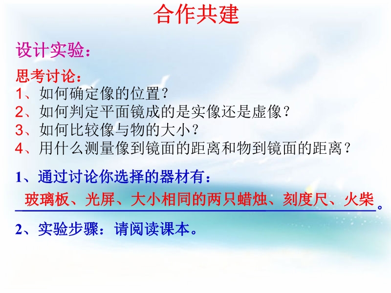 【内容简介】本课件以沪科版新教材第四章第二节为基础制作,共有15张幻灯片,并插入了一个flash动画。课件从生活入手,引导学生认识了平面镜的特点,并且引导学生通过“提出问题、猜想与假设、设计实验、进行实验、分析与论证”等科学探究环节,对平面镜成像的特点进行了探究,总结了平面镜成像的特点,课件以作图的形式引导学生认识了平面镜成像的原理等。本课件可供教学“平面镜成像”时参考使用。