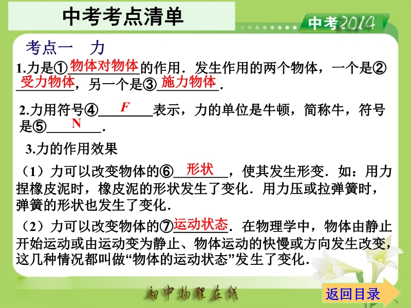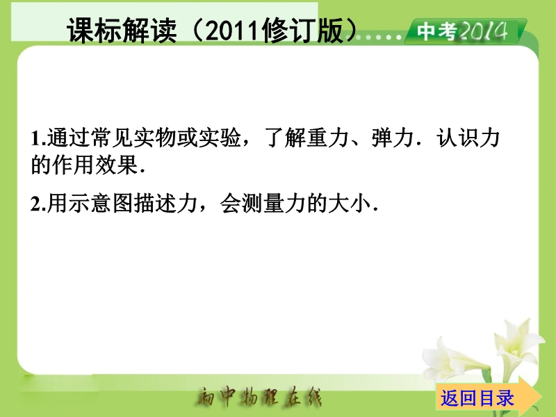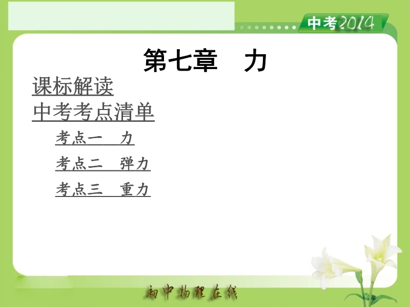 【内容简介】人教版2014中考备考策略《第7章 力》ppt课件,课件根据现行的人教版教材编辑的2014年中考复习课件,课件共有26张ppt幻灯片,课件分为如下几个环节组织复习:一课标解读,解读课标,分析考试的要求,明确复习的目的, 二 中考考点清单,引导学生复习了:考点一 力考点二 弹力考点三 重力三、常考类型剖析,解析中考常见题型。课件精选了难度适中的2013年全国中考试题,供教学参考使用。