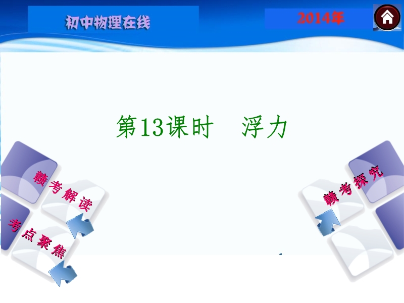 【内容简介】2014江西中考复习课件《第13课时 浮力》ppt课件,课件共24张幻灯片,课件从三个环节组织复习:1赣考解读 解读2011-2013三年江西省中考考查情况:题型、分值、难易程度和涉及的考点,预测了2014年江西省命题的形式、分值等。2 考点聚焦,本环节采用填空的形式,按知识点分别展示了:考点1 浮力 考点2 浮力的大小 考点3 浮沉条件及应用。2、赣考探究,以2011-2013年江西省省、各市试题中考试题载体展示常见的题型等,通过课件展示解析,总结方法,提高学生能力,供教学参考使用。