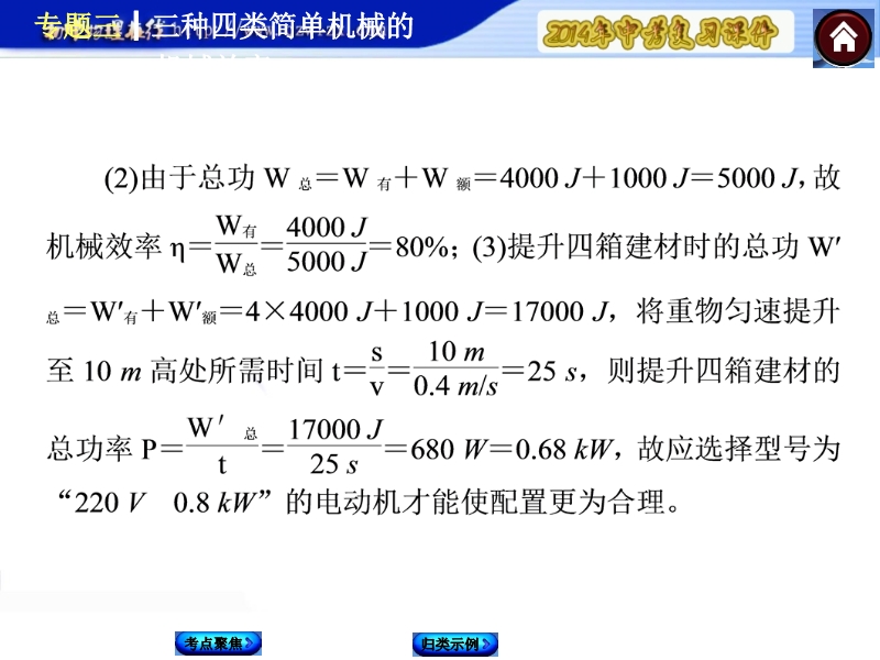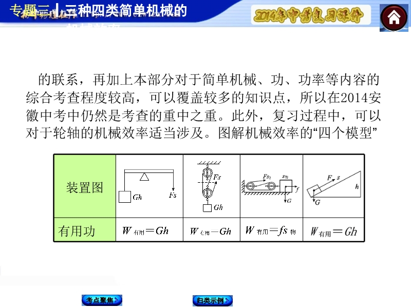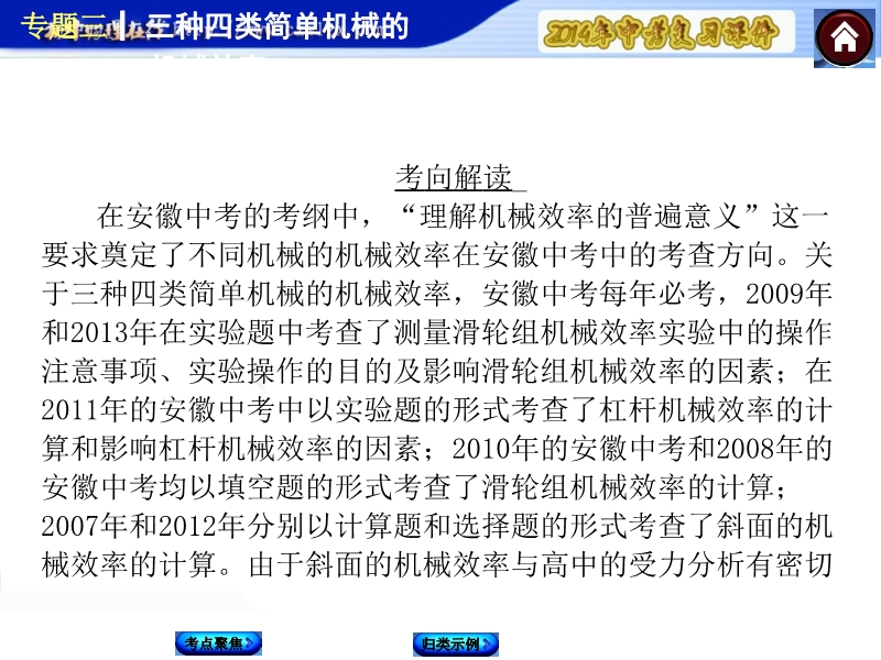 【内容简介】【最新—中考必备】(安徽专版)2014中考复习方案课件(考点聚焦+归类示例)-专题精讲:专题3 三种四类简单机械,课件根据现行的人教版教材编辑的14届中考复习课件,课件共18张ppt幻灯片,课件解读:类型一 滑轮组的机械效率 类型二 杠杆的机械效率 类型三 斜面的机械效率 等,课件采用讲练结合手段组织教学,供教学参考使用。