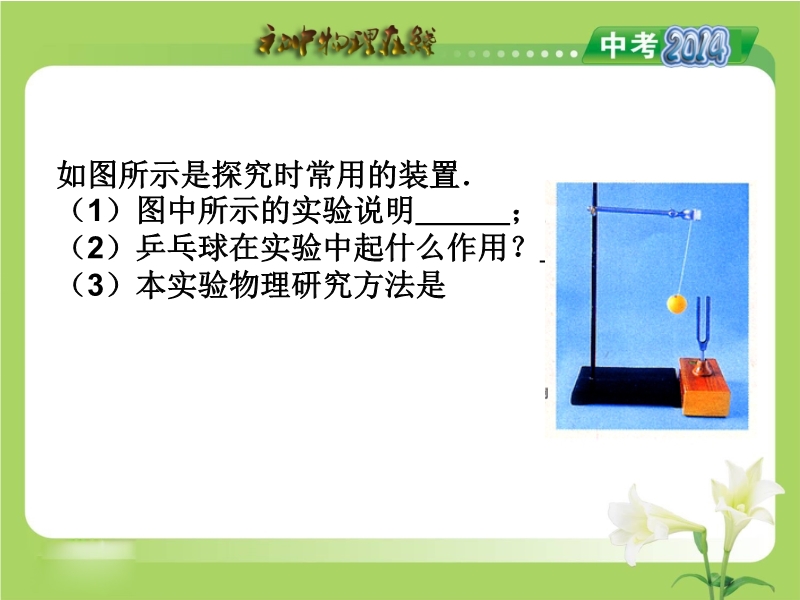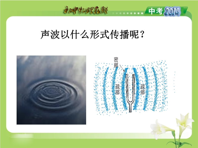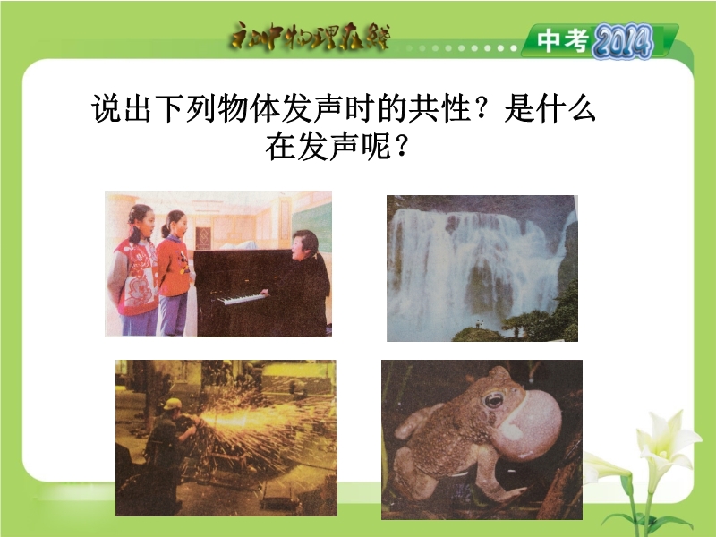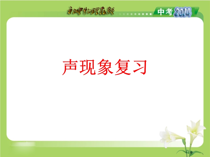 【内容简介】2014年中考《声现象》ppt复习课件。本课件以人教版新教材第二章内容为基础制作,共有40张幻灯片。课件设计不仅注重基础知识的巩固,更注意提高学生的技能,培养学生分析问题和解决问题的能力 。本课件可供中考复习时参考使用。