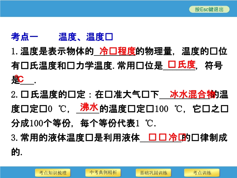 【内容简介】2014年中考物理复习专用课件 《 第3讲物态变化(一)》ppt课件,课件共62 张ppt幻灯片,课件从四个环节组织复习:1.考点知识梳理,课件梳理了:考点一 温度、温度计 考点二 熔化和凝固,以填空的形式展示,让学生进一步熟悉教材、运用知识。2、中考典例精析,课件精选了2013年中考试题,归纳解题方法,每道试题都有详细的解析过程。3、基础巩固训练,精选教材上或历年教学上经典试题、基础性较强试题,以达到巩固双基的作用 4、考点训练,针对考点,展示中考热点、易错题型,课件内容丰富、全面,设计合理、科学!