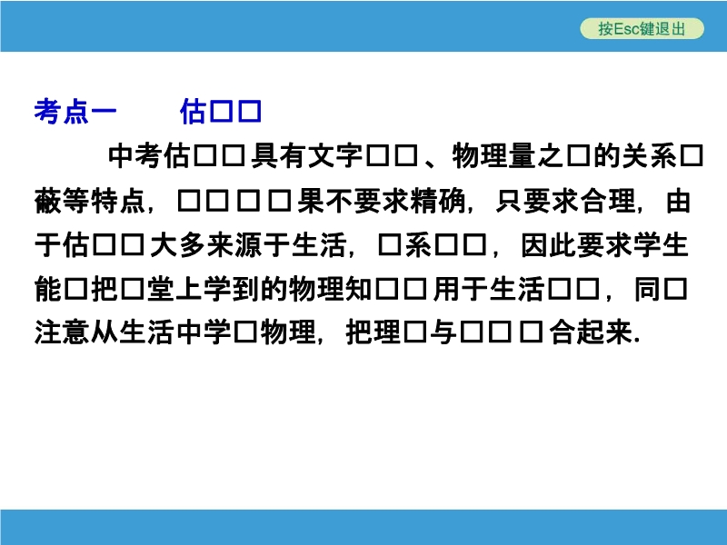 【内容简介】2014年中考物理复习专用课件:专题1 估测读数识图与电路故障分析题,课件共61 张ppt幻灯片,该专题共有4个考点:考点一 估测题 考点二 仪器读数题 考点三 图片信息题 考点四 电路故障分析题,课件分析了各个考点考察的形式等,之后按考点精选中考试题,通过试题的解析、点评等,提高学生对这一专题的解题能力。
