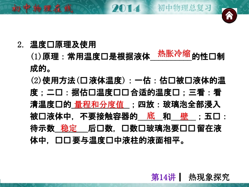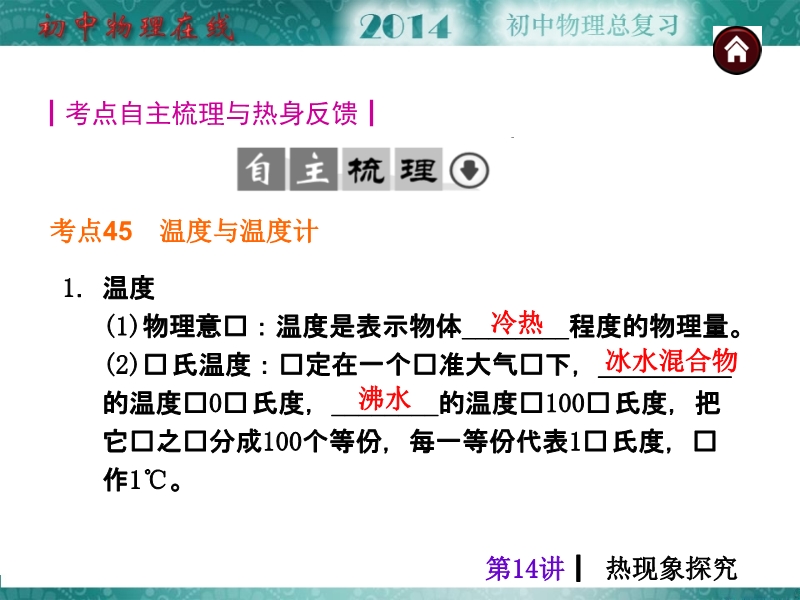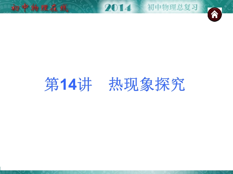 【内容简介】【中考夺分天天练】2014年人教版中考物理总复习:第14讲 热现象探究课件共有39 张幻灯片,课件“考点自主梳理”引导学生在课件自主复习的基础上,梳理本章主要知识要点:“ 温度与温度计 热现象实验探究”,通过“热身反馈”展示2013年中考试题,以达到学以致用的目的,一内容般地这部分简单,难度不大,引导学生认识中考考察的方式,课件的重点“考向互动中考探究与方法归纳”精选典型和热点内容的2013中考试题,通过分析、归纳突破本章的难点和突出热点,“考题自主训练与名师预“自主练习,预测2014