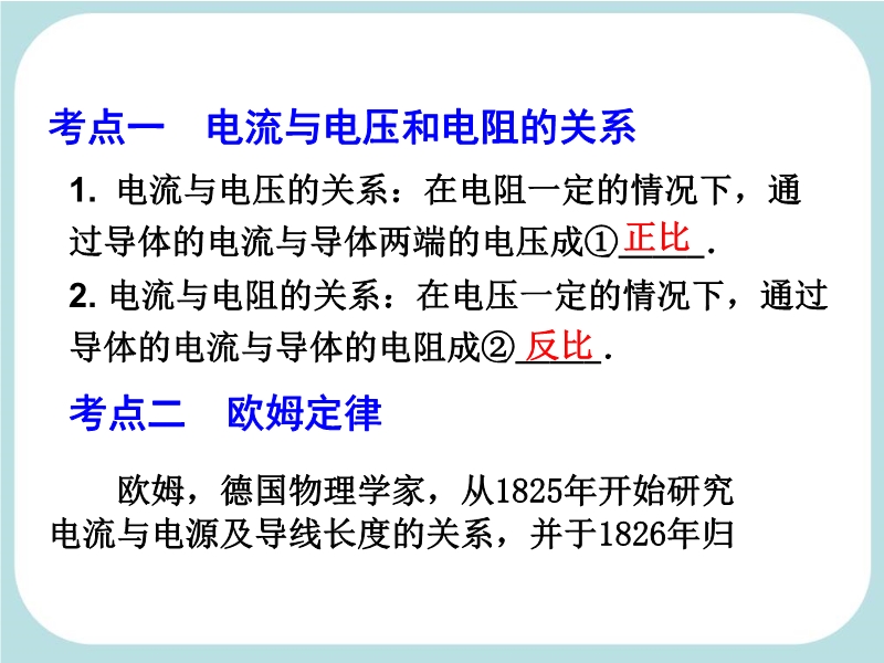 【内容简介】2014年乐泉初中中考复习课件:《第十七章 欧姆定律》PPT课件,课件共77张ppt幻灯片,课件首先分考点梳理:电流与电压和电阻的关系 欧姆定律 电阻的测量引导学生进一步熟悉教材。课件重点总结归纳了常见的题型: 欧姆定律的理解 动态电路分析 欧姆定律的相关计算,课件最后复习了本章二个实验实验一 探究电流与电压和电阻的关系 实验二 测量电阻。