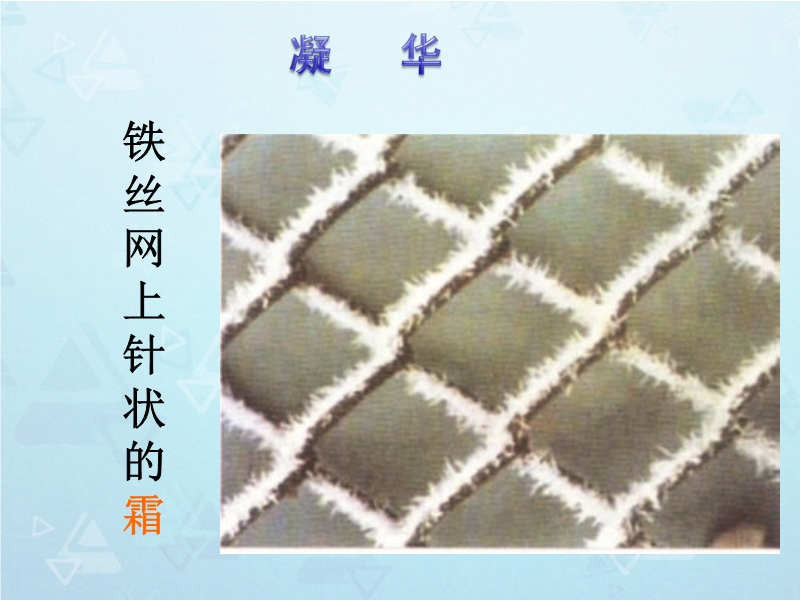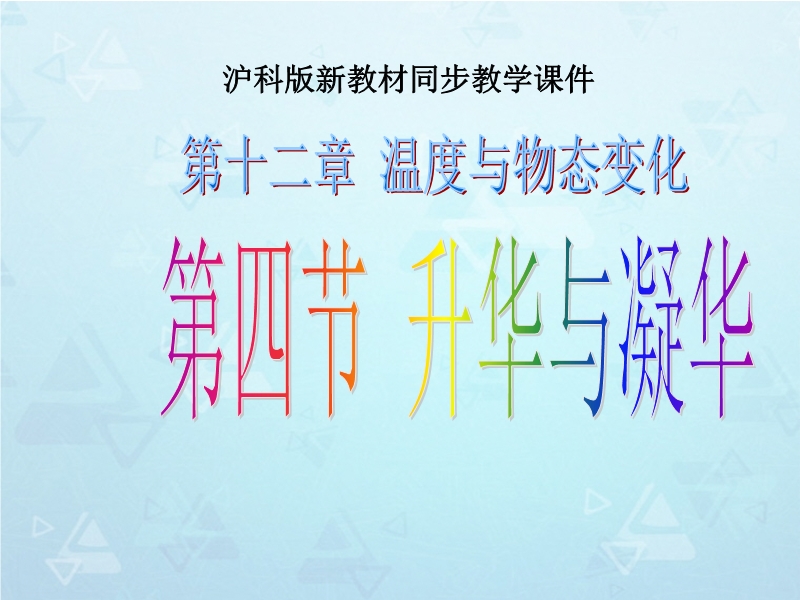 【内容简介】本课件以沪科版新教材第十二章第四节《12.4升华和凝华》为基础制作,共有38张幻灯片。课件首先展示了自然中和生活中常见的现象,引导学生认识了什么是升华、什么是凝华,并讨论了升华与凝华的特点,然后展示了它们的应用,如人工降雨、舞台烟雾等。最后展示了水在自然界中存在的各种形态。本课件可供教学“升华与凝华”时参考使用。