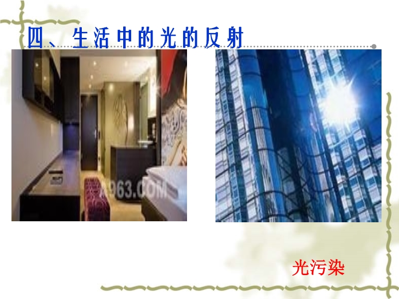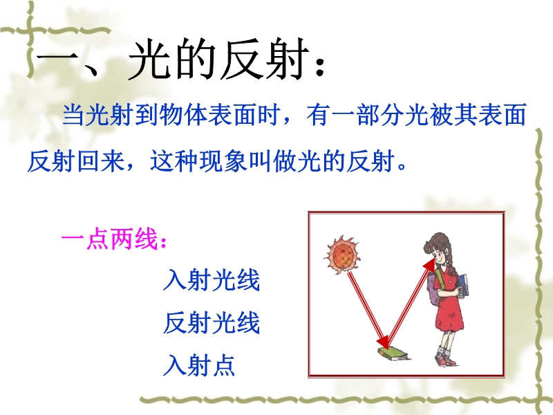 【内容简介】江苏省优质课:南通市唐闸中学《3.5光的反射》课件+教案,共有10张幻灯片和一份教案。主要引导学生认识了日常生活中光的反射现象,引导学生通过实验探究了光的反射规律,认识了镜面反射和漫反射,向学生展示了光在日常的应用。