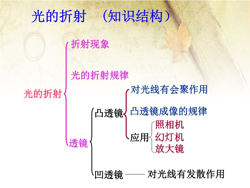 【内容简介】浏阳市官渡镇初级中学:《第五章 透镜及其应用》复习ppt课件,共有19张幻灯片和6个flash动画。课件引导学生详细而具体地回顾了本章的主要内容,展示了本章的具体知识,按节进行回顾知识,通过flash动画模拟,再现知识的生成过程。