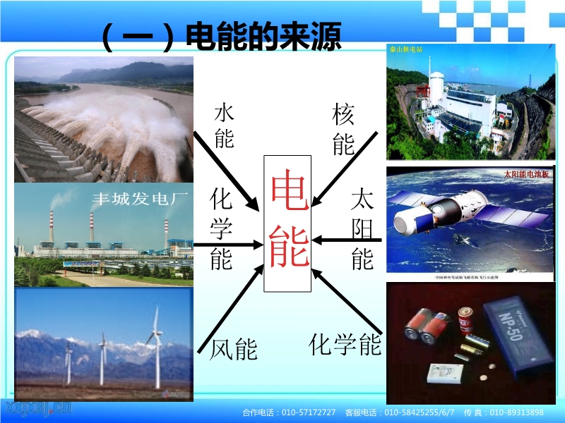 【内容简介】人教版:《18.1电能电功》ppt课件,课件共33张幻灯片组成。本课件通过一些精美的图片介绍了火力发电、核能发电、风力发电等,介绍了电能的由来,电能的广泛的应用,电能的几个单位以及它们之间的换算,又介绍了电能表的使用和一些重要参数.课件有练习,注重能力的提高。