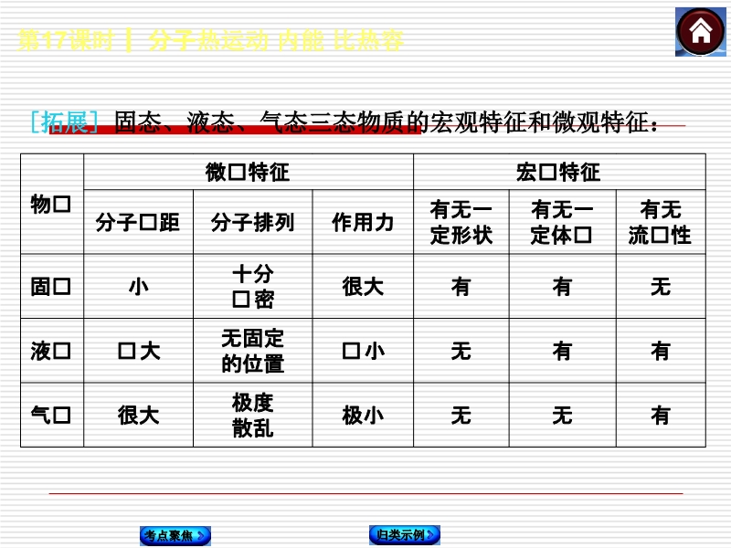 【内容简介】2015届人教版中考复习方案:《第17课时 分子热运动 内能 比热容》ppt课件,课件根据现行的人教版教材编辑的15届中考复习课件,课件共30张ppt幻灯片,课件分为如下几个环节组织复习:1.考点聚焦,按照如下考点:考点1 分子热运动 考点2 内能 热量 考点3 比热容 内能与机械能的区别 温度、热量、内能的比较 ,组织学生复习本节基础知识点,课件主要通过填空形式再现基础知识点,同时通过点拨形式对该知识点的难、易错指导、辨析等。2.归类实例,课件总结中考考查知识点的类型,通过2014年中考试题的展示,解析和点评,总结方法,提高学生能力,课件最后通过方法集锦,突出重点、突破难点。