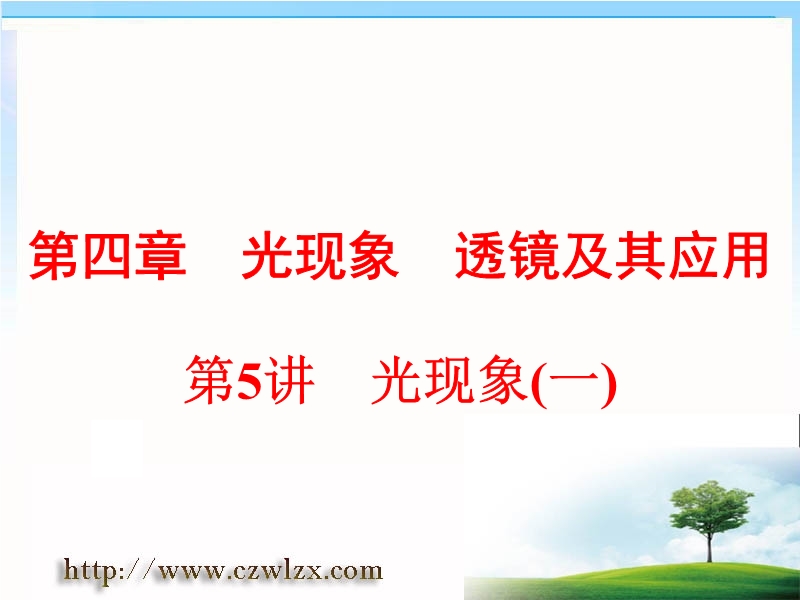 【内容简介】【中考备战策略】2015年中考物理(人教版)总复习:《第5讲 光现象一》PPT课件,课件共89张ppt幻灯片,课件首先对本章内容进行考点知识梳理,,第二部分是中考典例精析,课件归纳中考重要考点同时分析该考点的命题点:考点一 正确区分三种光现象(命题点:(1)光的直线传播现象;(2)光的反射现象;(3)光的折射现象)考点二 光的反射(命题点:(1)探究“光反射时的规律”的实验;(2)光的反射定律及应用;(3)镜面反射和漫反射 考点三 平面镜成像(命题点:(1)探究“平面镜成像的特点”的实验;(2)平面镜的成像特点及应用),以中考试题为抓手,通过评析试题,进一步巩固知识点,同时提高学生的解题能力,课件的第三部分是巩固练习,精选道试题进一步提高运用知识的能力。课件最后部分考点训练,该部分是一套试卷,由选择题、填空题、实验探究题和计算题,该部分内容按中考要求制作(21道试题)。