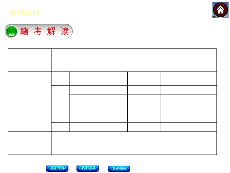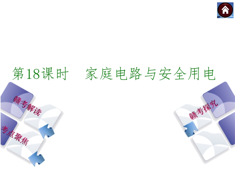 【内容简介】2015届江西省中考复习方案:《第18课时+家庭电路与安全用电》PPT课件,课件共16张ppt幻灯片,课件从如下几个方面组织学生复习:1.赣考解读,分析了江西中考考试说明对应考点,近三年江西省中考考查情况:题型、分值和考点,最后预测2015,预测题型、分值和考查的手段;2考点聚焦,通过填空形式,再现教材基本知识点:家庭电路的组成 试电笔 家庭电路中电流过大的原因 安全用电 ,同时对难点进行点拨和扩展,3赣考探究,根据以上知识要点,列举近几年来江西省的中考试题和14年各市的模拟试题提高能力,掌握方法,课件最后进行归纳点拨了“家庭电路中的故障判断方法”。