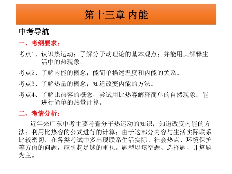 【内容简介】广东省2015中考物理冲刺复习课件:《第13章+内能》PPT课件,课件共有17张幻灯片,课件首先是中考导航环节,根据考纲要求列出考点同时分析了考情;第二环节是考点梳理,通过填空的形式梳理本章基础知识要点;课件第三个环节是重难点突破以及重点实验剖析,对本章的“一、认识热运动二、温度、热量、内能的关系 三、 比热容 四、热量计算 剖析重点实验 探究物体的吸热能力 ”等考点采用讲练结合突出重点,突破难点;课件最后精选广东省中考试题和其他省市部分中考试题进行精练,进一步提高解题能力。