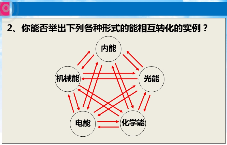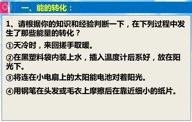 【内容简介】人教版:《14.3能量的转化和守恒》PPT课件,课件共有21张幻灯片。课件引导学生回顾常见的各种能量之间的相互转化,总结了能量守恒定律。通过精选的习题,提高学生运用知识的能力。