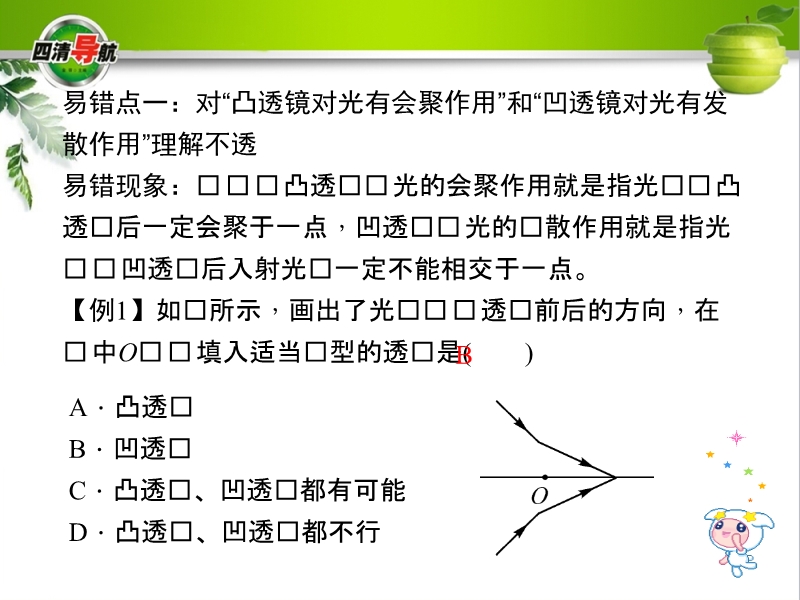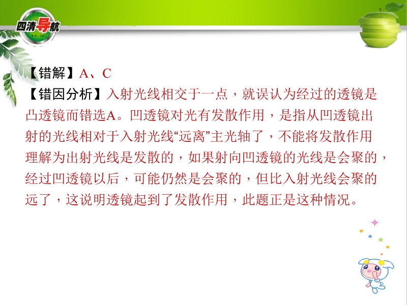 【内容简介】四清导航课件:人教版《第五章 透镜及其应用--易错盘点》知识点训练ppt课件,课件共有12张幻灯片,课件列举了如下常见易错点:易错点一:对“凸透镜对光有会聚作用”和“凹透镜对光有发散作用”理解不透,易错点二:物距变化时对像的性质分析不到位 易错点三:近视眼和远视眼的视力矫正方法,分析易错点的原因,通过习题列举,举一反三,教师的点拨讲解,进一步理解教材中易错知识点。