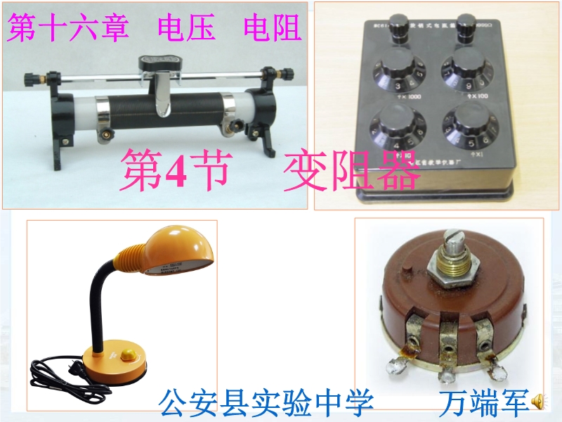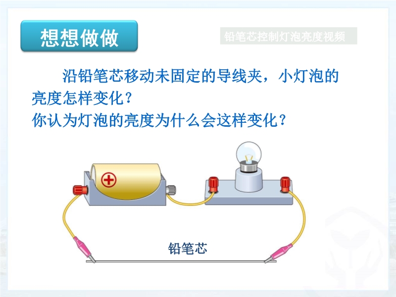 【内容简介】人教版:《16.3电阻》PPT+视频+flash课件,共有22张幻灯片,课件引导学生认识改变电阻实现改变电路中的电流大小,然后引导学生认识了导体电阻的存在,学习了电阻的定义、单位等。课件还引导学生设计实验探究了电阻的大小与导体的横截面积、长度、材料的关系。