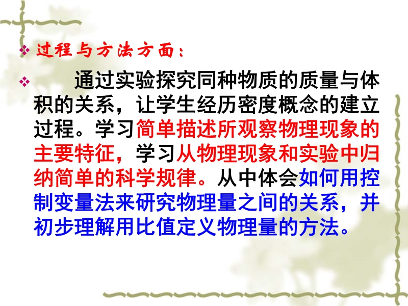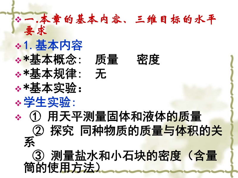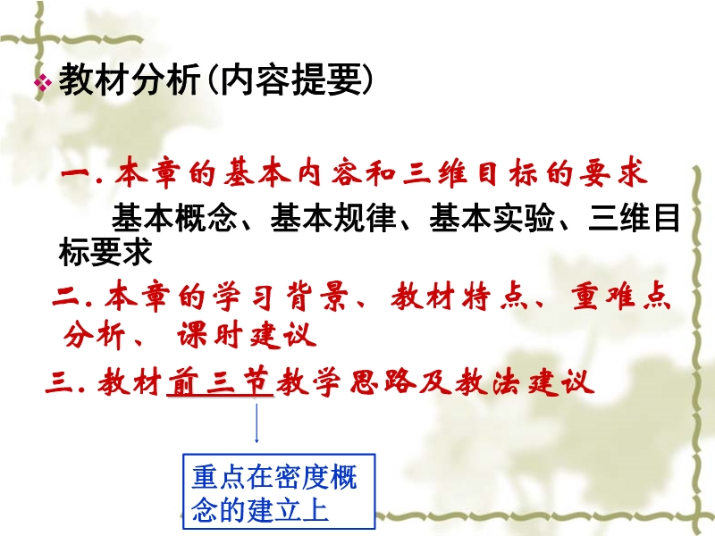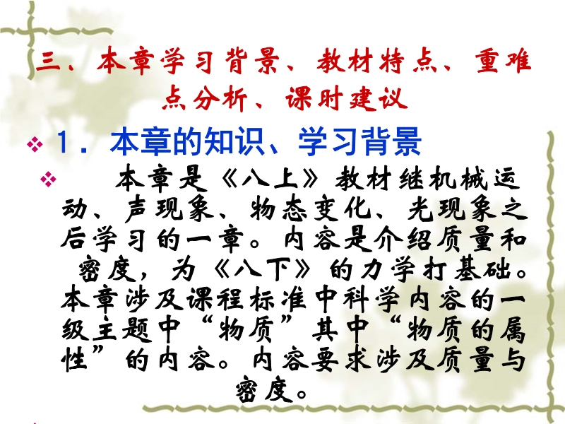 【内容简介】人教版:《第六章 质量与密度》教学建议课件,课件有115张幻灯片,课件分析了教材,引导教师如何备好课,同时给出了一些建议和要求等。