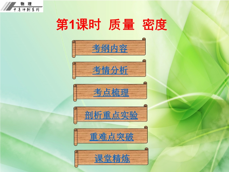 【内容简介】【中考冲刺】人教版2016年初中物理中考复习课件 《 第六章 质量与密度》ppt课件,课件共有61张幻灯片,课件设计了考纲内容;考情分析;考点梳理;剖析重点实验;重难点突破;课堂精炼等栏目,考纲内容引导学生认识了本章的主要考点,通过考情分析分析近几年来中考命题的形式,考点梳理主要引导学生复习教材基础知识内容,剖析重点实验通过引用2015年中考试题,通过变式训练突破“托盘天平的使用、对密度概念的正确理解”等难点,最后精选试题提高能力!