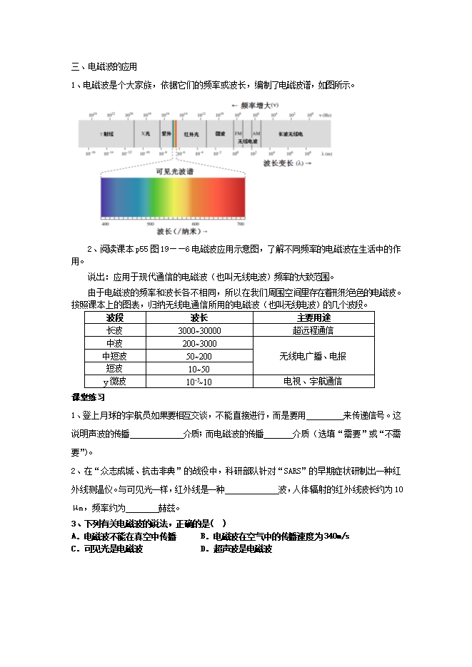 【内容简介】飞机上的飞行员与地面指挥员的对话不用电线;我们每天听收音机或看电视,也没有电线直接通向电台或电视台。可见,这些都不是用电线来传播电信号的,我们称作“无线电通信”。那么,无线电通信是怎样传输信号的呢? 课前导学 1、电磁波的产生条件是 ; 2、电磁波的传播 介质,真空中电磁波的传播速度是 ; 3、波速、波长、频率的关系是 。 课堂导学 二、电磁波是怎样传播的? 1、演示:把一个移动电话放在真空罩中,并给这个移动电话打电话,看这个移动电话是否能够收到信号。 现象是 ; 说明了 。 还举一现象可以说明这一点: 。 2、真空中电磁波传播的速度是 ,电磁波频率的单位是 ,符号是: ,常用单位是 和 。 .......