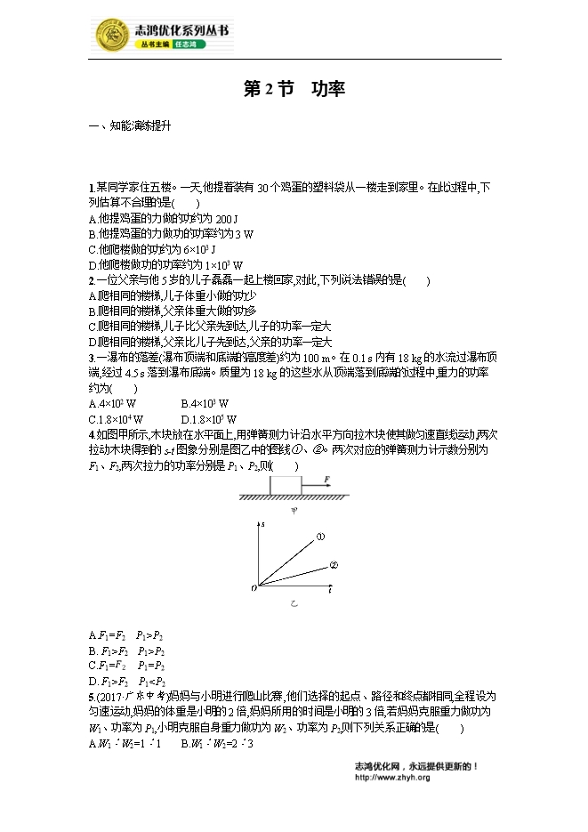 .如图甲所示,木块放在水平面上,用弹簧测力计沿水平方向拉木块使其做匀速直线运动,两次拉动木块得到的s-t图象分别是图乙中的图线①、②。两次对应的弹簧测力计示数分别为F1、F2,两次拉力的功率分别是P1、P2,则( )