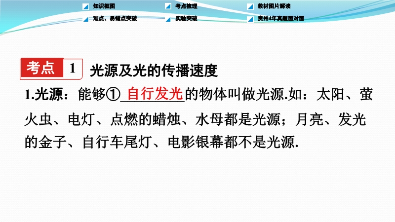 【内容简介】贵州省2018年中考物理复习《第四章 光现象》ppt课件共有50张幻灯片,复习主要分为知识框图、考点梳理、教材图片解读、难点易错点突破等环节,对中考各个知识点进行全面系统的复习。