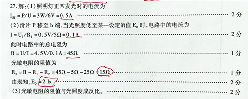 本题的有效信息为:电源电压为4.5V,定值电阻为R1=5Ω,滑动变阻器的最大阻值,光敏电阻的规律,当R1两端电压为0.5V时,光照度达到设定值E0!最后这个条件非常重要,能直接影响到第三问解答。