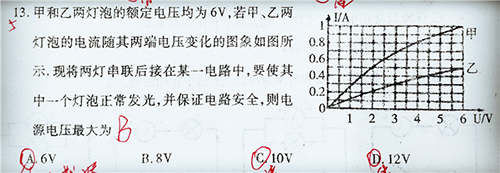 详解:由于两个灯泡的额定电压都是6V,要使其中一个灯泡正常发光,也就是需要使其两端的电压达到6V,我们从伏安图像中找到6V坐标,可以看到甲的额定电流为1A,乙的额定电流为0.5A,如果我们选择了1A,就会把乙灯泡烧坏,因此只能选择小电流0.5A,此时,从图中可以看出来,甲灯泡两端的电压为2V。因此电源电压为2V+6V=8V。答案为B选项。