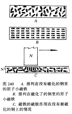 图238是照着相片画下来的一张有趣的图画:画上有一只人的臂膊横放在电磁铁的两极上,臂膊上向上竖着一簇簇铁钉,好像刚毛一样。臂膊本身是完全感觉不到磁力的:看不见的磁感线穿过臂膊的时候,是一点也不会暴露自己的存在的。可是这些铁钉在磁力的作用下,却顺从地按照一定的次序排列着,让我们看到那些依着曲线从一极走向另一极的磁感线的方向。