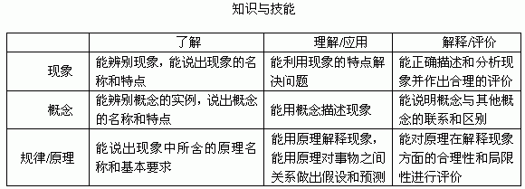 对能力的考查是中考的一个重要方面,它实际解决考到什么程度的问题,特别是在具体的情景中运用所学的知识分析和解决问题的能力是考查的重点。目前对能力的分类理论,以美国教育测量专家布卢姆(B、S、Bloom)的目标分类理论最为显著,他认为认知领域教育目标分类,应该着重于知识和能力的意义,按照从简单到复杂的顺序划分为六个层次,即:知识、领会、运用、分析、综合、评价。在情感领域也有相应的层次。根据这一理论,物理课程标准从教学的角度将“知识与技能”根据知识的重要程度不同划分为四个层次,即:了解、认识、理解、独立操作;将“情感态度与价值观”划分为三个层次,即:经历、反应、领悟;而将“过程与方法”划分为六个层次,即观察、提出问题、信息收集、信息处理、分析概括和交流能力。而从考试测量的角度说,有些问题不易测量,如物理实验中的独立操作。因此根据布卢姆的目标分类理论结合物理学科和考试测量的技术与要求,我们将中考物理的能力要求划分如下表所示: